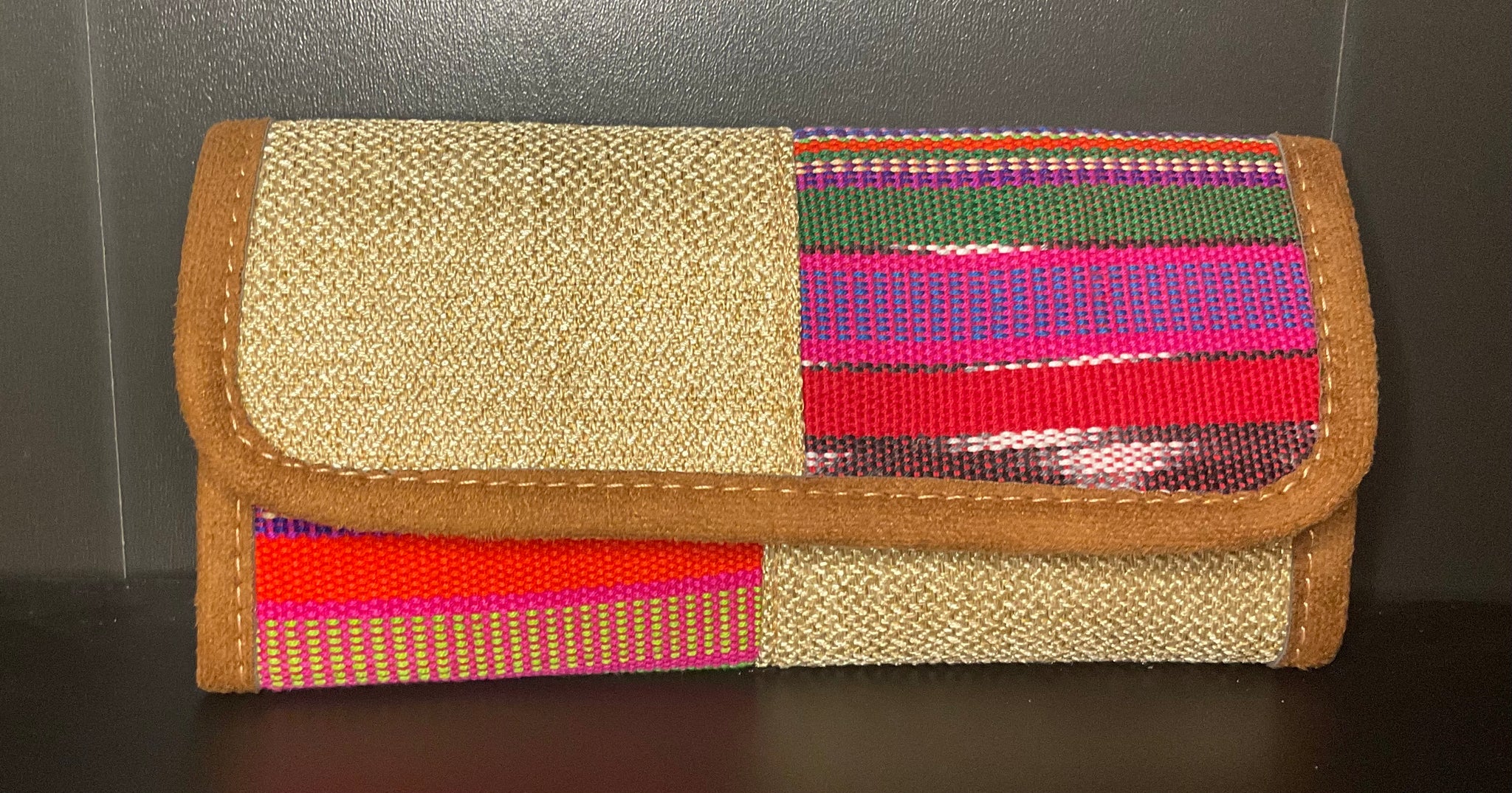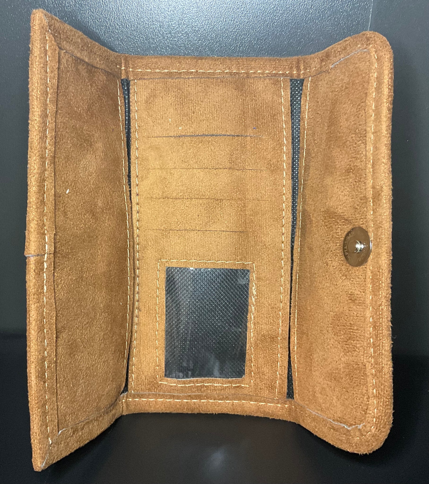 Tri fold Wallet hand stitched not he outside and pure Authentic Suede Leather inside. Plenty of pocket, ID , and slot space with outside zipper pocket on the outside.